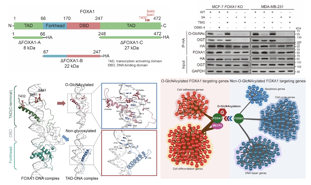 近日,我校生命科学与药学学院刘宇博/张嘉宁团队在线发表了题为“FOXA1 O-GlcNAcylation-mediated transcriptional switch governs metastasis capacity in breast cancer”研究论文。该研究成果揭示了O-GlcNAc糖基化修饰通过调控转录组重编程因子先驱因子FOXA1的染色质定位,改变细胞粘附相关多种下游基因表达,从而增强乳腺癌的转移等恶性表型的新机制。