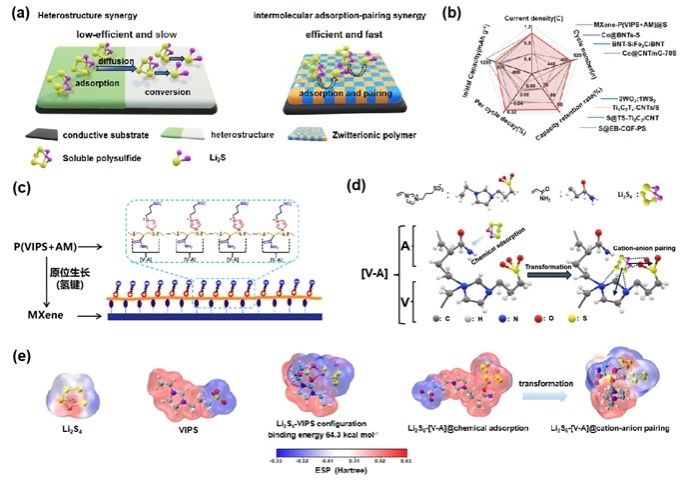 上述工作通过共价固硫方式有效抑制了多硫化物穿梭。然而,仍存在多硫化物转化动力学缓慢而导致容量骤减难题,影响锂硫电池实际应用。当前,异质结构策略被认为是有效解决方案之一,在充放电过程中的多硫化物会经历“吸附-扩散-转化”过程,低效且缓慢。鉴于此,该课题组提出了分子间“吸附-配对”协同新策略,在MXene上原位生长两性离子共聚物,通过邻近官能团的协同作用促进多硫化物转化。多硫化物被酰胺基吸附,随后与相邻的两性离子结构配对,如图2所示,高效促进多硫化物转化。在1 C条件下,经过500次循环后,其容量保持率为92%,平均每圈容量衰减率仅为0.017%。该工作以“分子间吸附配对协同作用促进多硫化物氧化还原反应以实现高稳定性锂硫电池”(Intermolecular adsorption-pairing synergy for accelerated polysulfide redox reactions towards lithium-sulfur battery with high stability)发表在知名期刊能量存储材料(Energy Storage Materials)(Energy Storage Materials, 2023, 55, 21.影响因子:20.8)。