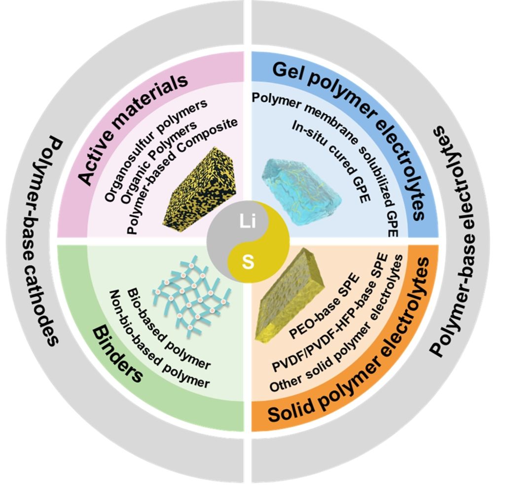 图5.高分子材料在锂硫电池电极和电解质中的多功能应用示意图