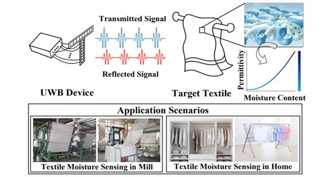 该成果由我校林驰副教授、王兆赫(2022级硕士研究生)、熊杰教授(麻省大学、微软亚洲研究院)、李凤岐教授(大连交通大学合作学者)以及吴国伟教授共同完成。该论文以纺织品湿度检测为研究背景,提出了一种基于超宽带(UWB)信号的非接触式湿度测量系统MSoT。该系统通过检测纺织材料湿度变化引起的UWB信号反射特性变化,实现了对纺织品湿度的精确测量。现有的湿度检测方法大多依赖于接触式传感器,且难以应对纺织品的弱反射信号问题,而本研究首次提出了利用无线信号进行纺织品湿度精细测量的方法,并在各类复杂场景下验证了其有效性。在论文中,研究团队首先建立了一个理论模型,通过分析纺织品在不同湿度条件下的介电性能变化,进一步推断目标对UWB信号的反射特性的影响,构建了湿度与信号特征之间的映射关系。其次,通过MIMO天线阵列和波束成形技术增强了目标信号的反射,并采用小波去噪技术进一步提高了信噪比。在不同材质、尺寸、厚度的纺织品样本上进行的大规模实验表明,该系统的湿度测量误差在1.4%以内,可提供持续精确的湿度检测结果。