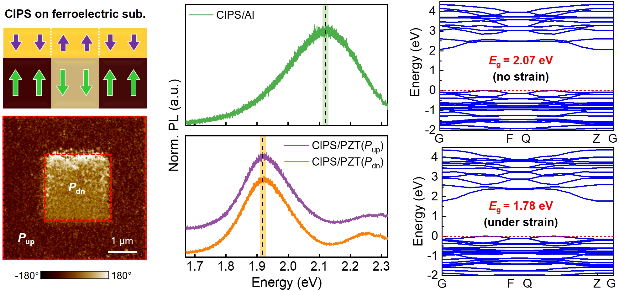 鉴于此,李大卫教授团队采用光致发光(PL)光谱、压电力显微镜(PFM)和密度泛函理论(DFT)计算相结合的方法,阐明了基于铁电衬底的界面应变诱导CIPS中铁电调控与增强。PFM测试发现,薄层CIPS纳米片形成了与PZT和P(VDF-TrFE)铁电薄膜相同的畴结构,表明通过铁电衬底增强了CIPS的极化取向。PL光谱结合DFT计算分析显示,与在一般衬底上CIPS相比,在铁电衬底上CIPS的PL发射峰出现了显著的红移(高达0.21eV),从而揭示了界面拉伸应变诱导的CIPS晶格变化。通过比较分析PZT和CIPS/PZT上的单层MoS2的PL光谱,证明了CIPS的极化取向与铁电衬底的极化取向是反向对齐关系。原位变温PL光谱研究表明,在铁电衬底上的薄层CIPS表现出增强的TC(>200℃)。相关研究成果以“基于铁电衬底的界面应变诱导CuInP2S6中铁电调控与增强的实验证明”(Optical Evidence of Interfacial Strain-Induced Ferroelectric Tuning and Enhancement in CuInP2S6via Ferroelectric Substrate)为题,发表在《微尺度》(Small)(2024,2409879.影响因子:13.0),硕士生侯心怡为第一作者,李大卫教授为通讯作者