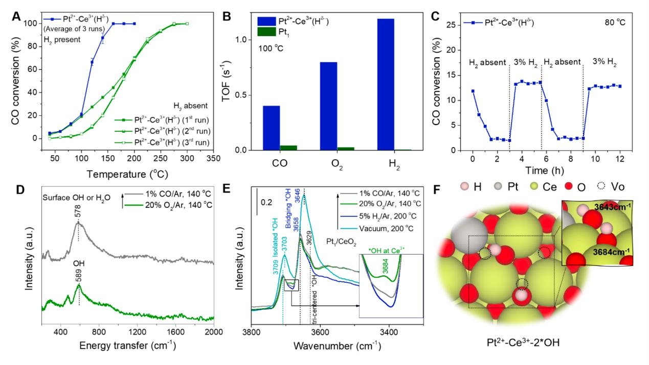 图2 Pt2+-Ce3+(Hδ)氢化位催化剂的催化性能和增强的O2活化