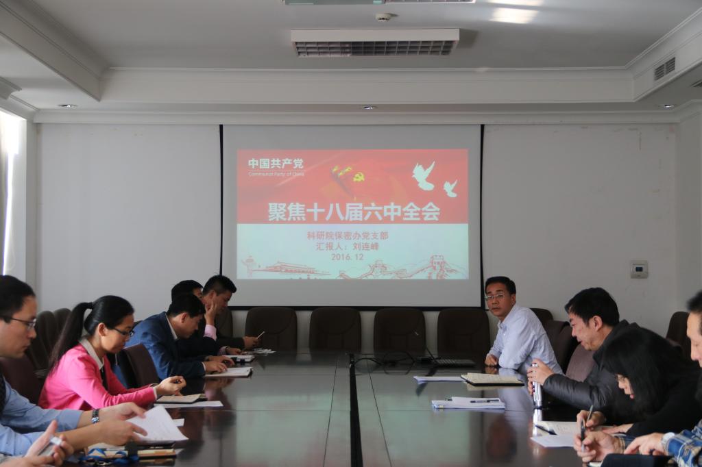 为深入学习党的十八届六中全会精神,按照机关党委要求,12月2日上午,科研院保密办党支部在主楼512召开了以“学习党的十八届六中全会精神”为主题的学习研讨会。会议由支部书记刘连峰主持。
