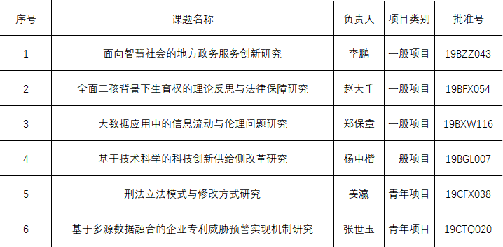 全国工作办公室于2019年7月12日公布了2019年国家社科基金年度项目和青年项目立项结果,已公布的获批项目中,人文学部获批6项,其中一般项目4项、青年项目2项,获批经费135万元。