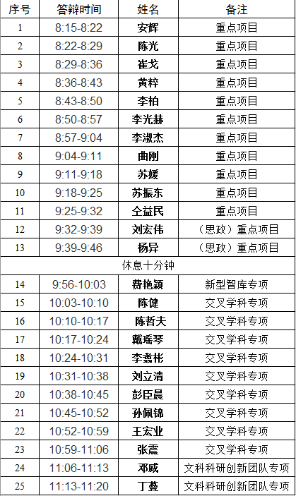 重点项目、思想政治理论研究重点项目、新型智库专项、交叉学科专项及文科科研创新团队专项负责人PPT介绍5分钟,回答问题2分钟,答辩人必须严格控制时间。