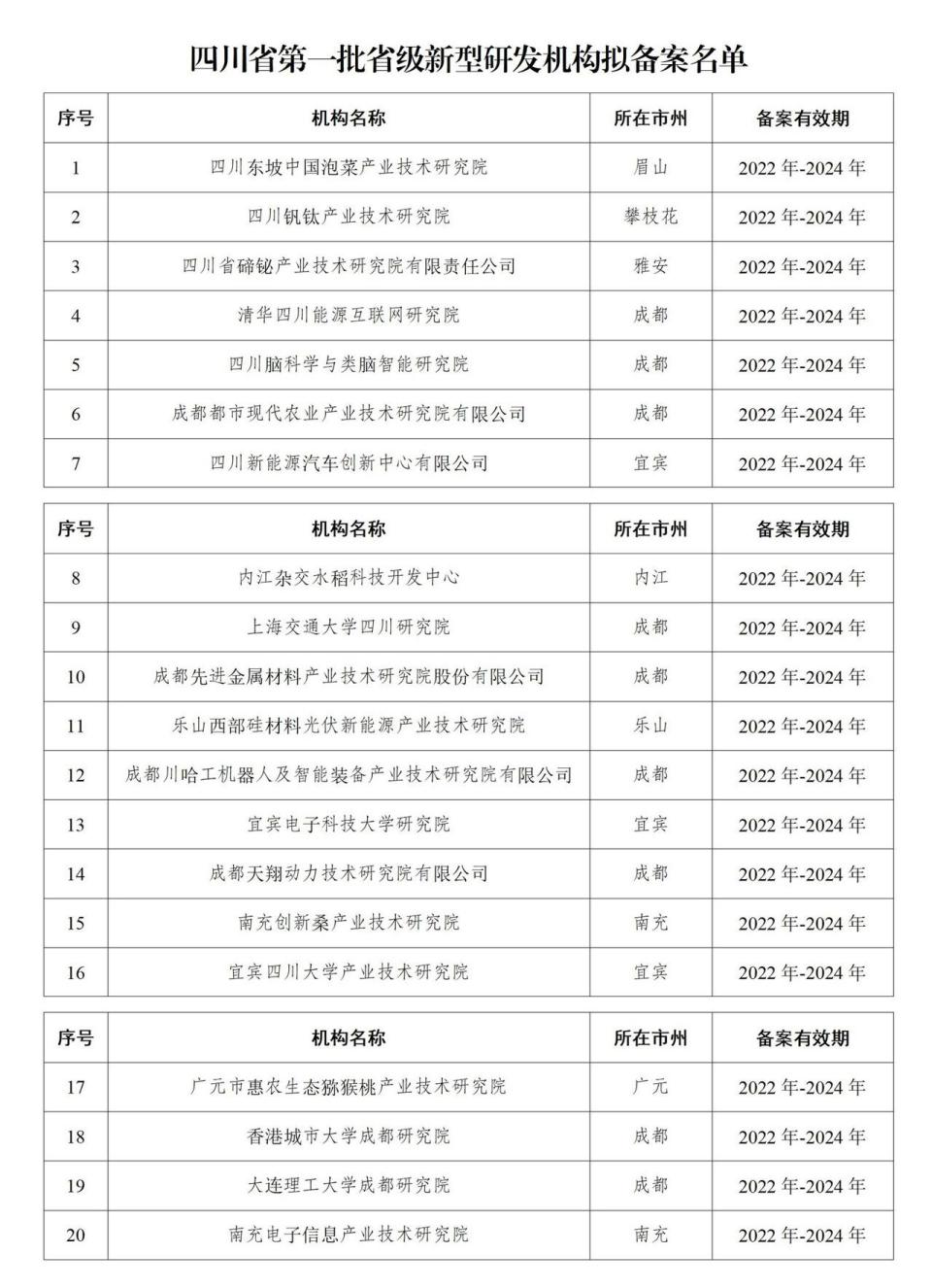 2022年7月22日,四川省科学技术厅发布《关于第一批省级新型研发机构拟备案名单的公示》,公示期7月22日-7月28日,我单位大连理工大学成都研究院成功入选。