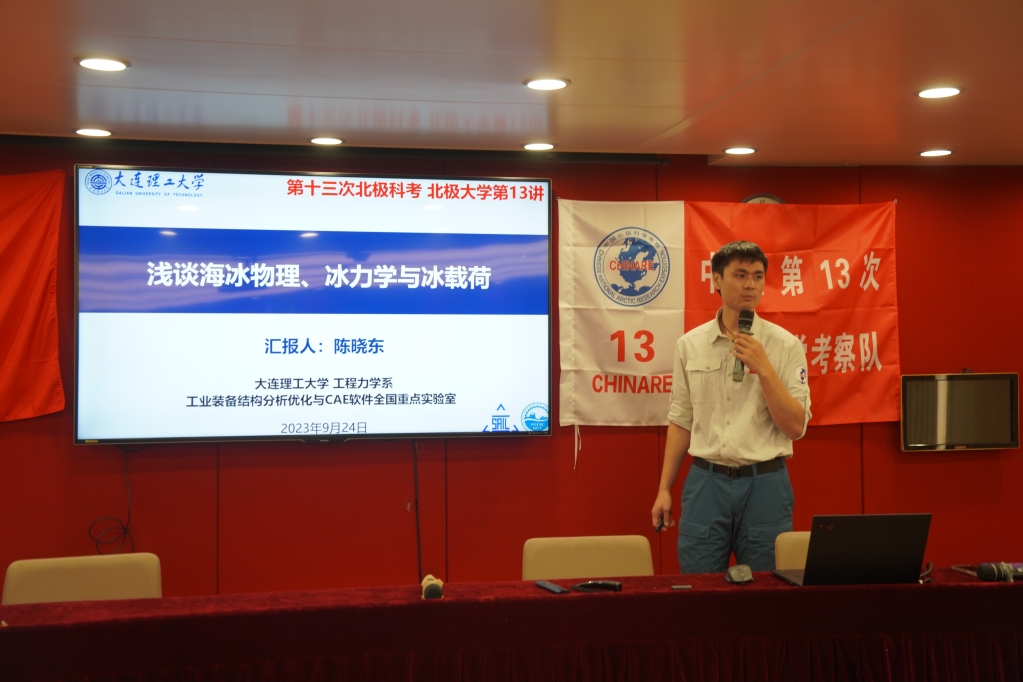 陈晓东进行的两项工作——首次针对北极海冰开展冲击载荷作用下海冰力学性质的现场试验工作与基于双目成像的海冰厚度无人化智能观测工作——均被纳入第13次北冰洋科学考察的研究亮点。工作之余,他还受邀担任“北极大学”的授课教师,与大家分享极地科考对海冰力学研究的意义。