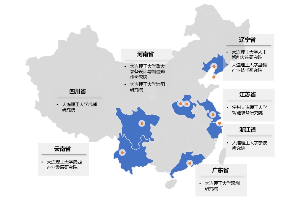 学校现有校外研究院9家,分布于全国7省9市,分别为大连理工大学深圳研究院、大连理工大学盘锦产业技术研究院、大连理工大学滇西产业发展研究院、大连理工大学重大装备设计与制造郑州研究院、常州大连理工大学智能装备研究院、大连理工大学成都研究院、大连理工大学宁波研究院、大连理工大学人工智能大连研究院、大连理工大学洛阳研究院。